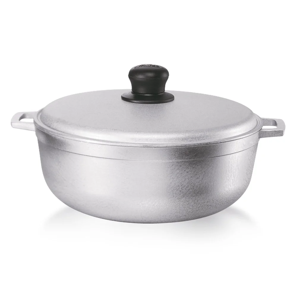 The 3. 7Qt Basic Caldero is an essential piece in every Hispanic kitchen, renowned for its durability and unique design. This caldero is manufactured in Colombia and is made of cast aluminum with a natural finish cooking surface that seasons over time. This cookware piece has a capacity of 3. 7Qt. The Basic Caldero includes its tight-fitting lid, steam vent for moisture control, and a convenient knob and side handles for safe operation. The thick walls will deliver consistent and delicious results each time. With this versatile piece, you can cook a variety of different meals. Whether creating gourmet dishes, cooking rice, simmering beans, braising meats, preparing stews, crafting sauces, or enjoying comfort foods, the Basic Caldero excels. The Basic Caldero is oven-safe without the lid, making it perfect for grilling and baking. After cooking, take this caldero straight from the kitchen to the table as a stylish serving dish. Trust the Basic Caldero for balanced, home-cooked meals. It will surely become your kitchen's beloved companion, uniting tradition, and innovation in every delectable creation. Elevate your culinary experience with this enduring symbol of Hispanic heritage.